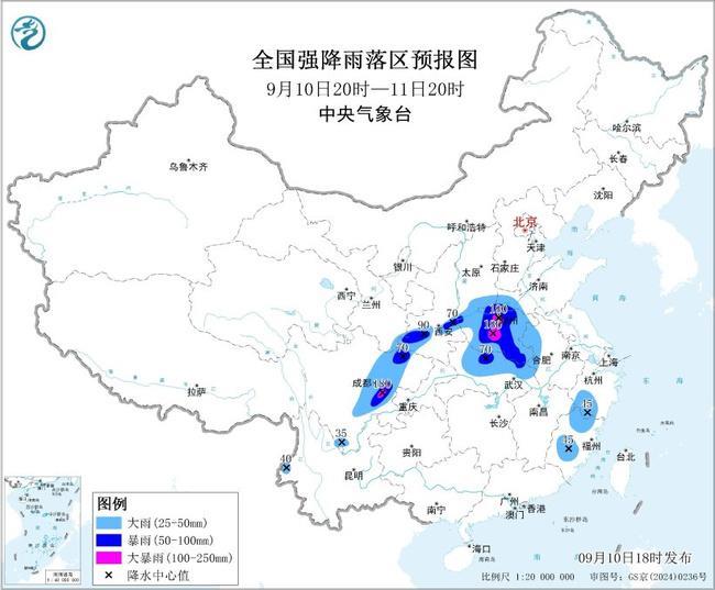 預計,9月10日20時至11日20時,河南大部、陝西南部、四川盆地中西部、湖北中北部、安徽西部、浙江南部、福建等地部分地區有大到暴雨,其中,河南中部、四川盆地西南部等地部分地區有大暴雨(100~180毫米)。上述部分地區伴有短時強降水(最大小時降雨量20~50毫米,局地可超過60毫米),局地有雷暴大風等強對流天氣。