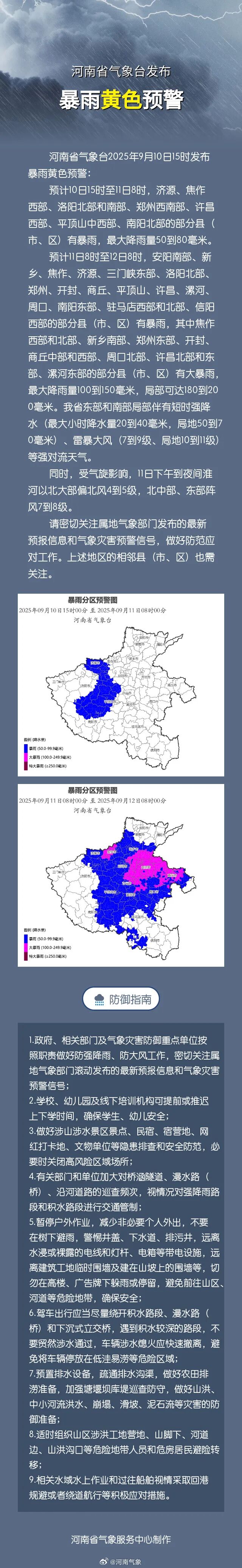 河南省氣象台2025年9月10日15時發佈暴雨黃色預警:預計10日15時至11日8時,濟源、焦作西部、洛陽北部和南部、鄭州西南部、許昌西部、平頂山中西部、南陽北部的部分縣(市、區)有暴雨,最大降雨量50到80毫米。