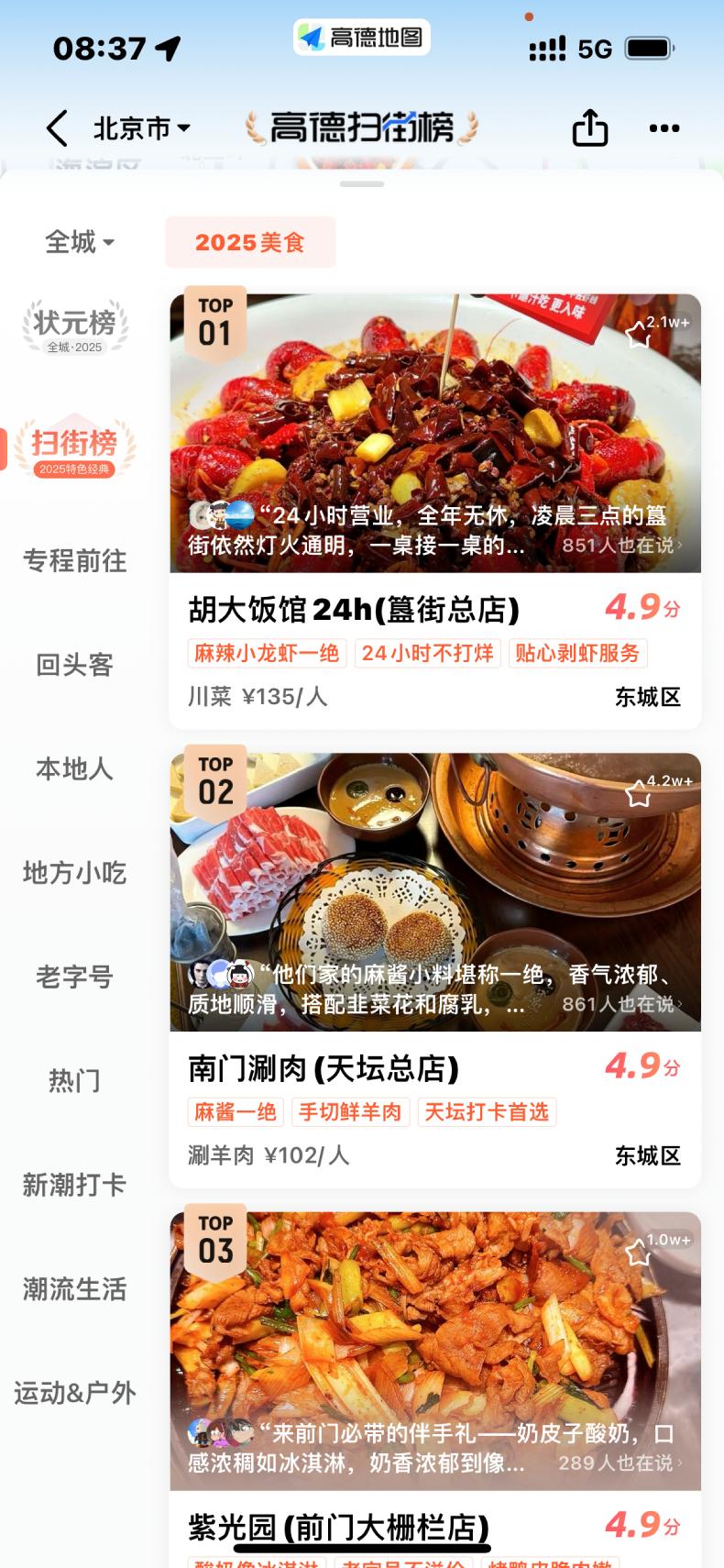 對於一個榜單來説,真實可信的評分是內核,全面豐富的信息是基礎。在此基礎上,高德掃街榜推出很多獨有的特色榜單。比如“專程前往”榜單,即指用户願意花費一定的時間,跨越一定的距離去往一家店鋪。這代表着消費者願意為這家店支付更高的時間和經濟成本。再如回頭客榜單,即多次到訪同一家店,代表了對店鋪的長期肯定。