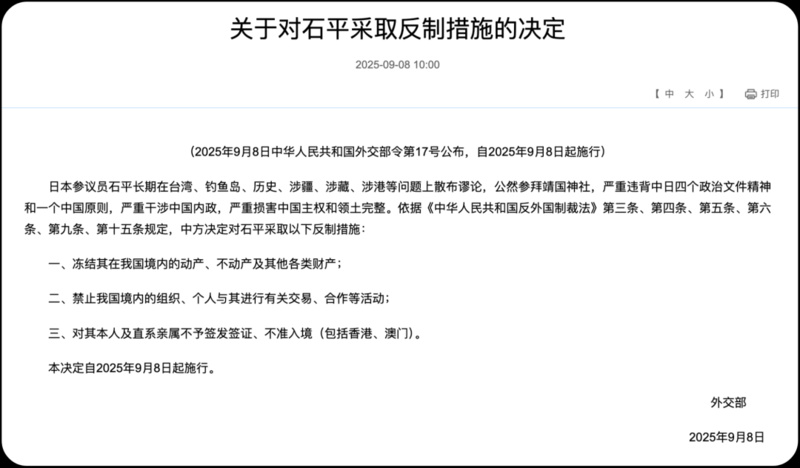 9月8日,中方宣佈對日本參議員石平採取反制措施,禁止其進入中國境內,凍結其在華資產,並限制其與中國的商業往來。