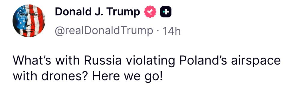 此次通話前,特朗普在社交媒體上發了一句簡短的話:“俄羅斯的無人機怎麼會侵犯波蘭領空?又來了!”
