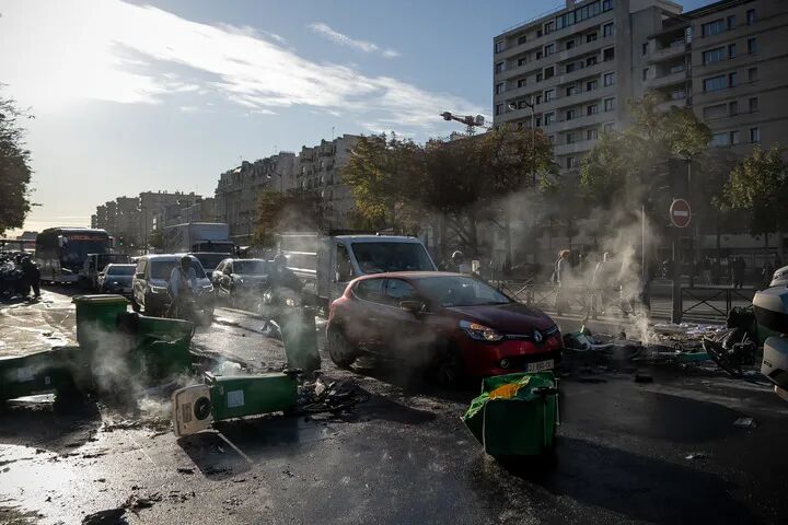 9月10日,在法國巴黎街頭,示威者用垃圾桶封鎖道路。新華社發(奧雷利安·莫里薩爾攝)
