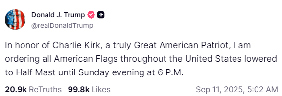 事發後約3小時,特朗普在社交媒體發文説柯克已經死亡,並向他的妻子和家人致以慰問。特朗普同時下令全國降半旗誌哀,一直持續到14日傍晚6時。猶他州媒體稍早報道,猶他州眾議院議長説,執法機構人員已向其報告柯克死訊。