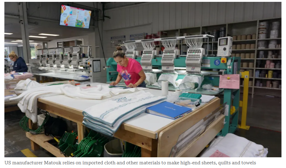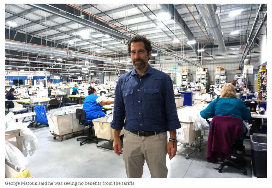 馬圖克表示,從今年4 月到 8 月,關税導致其每月增加超過 10 萬美元的成本,因為高額關税影響了來自印度和葡萄牙的棉布、來自列支敦士登的羽絨等原材料的供應。不僅如此,增加的成本還迫使企業削減了在新設備以及營銷方面的開支。喬治•馬圖克説,他“沒有從關税中看到任何好處”。