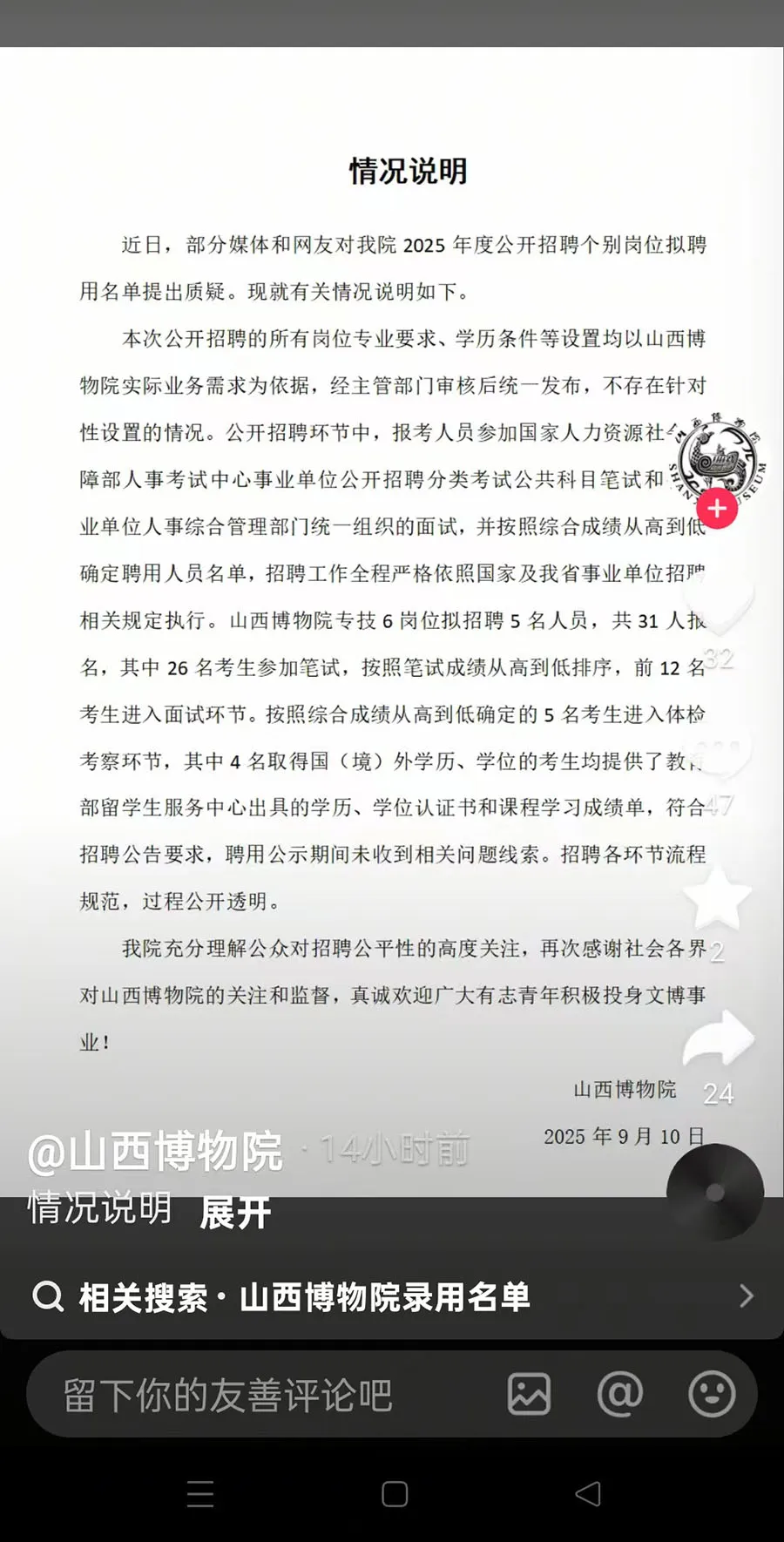 9月10日,山西博物院就部分媒體和網友對其2025年度公開招聘個別崗位擬聘用名單提出質疑,發表情況説明。全文如下: