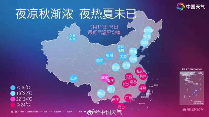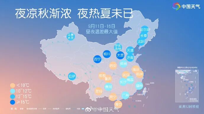 *9月11日20時至9月12日20時:*沿淮和淮北地區陰有陣雨或雷雨,雨量中到大,部分地區暴雨,局部大暴雨;其他地區多雲到陰,午後有分散性陣雨或雷雨,局部雨量中等。最高温度:沿江和蘇南地區31~32℃,淮北北部地區24~25℃,其他地區28~29℃;最低温度:本省西北部地區20℃左右,其他地區23~24℃。沿淮和淮北地區偏東風轉偏北風,風力都是5級陣風6-7級,其他地區偏東風轉西南風,風力都是4-5級,有雷雨地區雷雨時短時陣風8-10級。