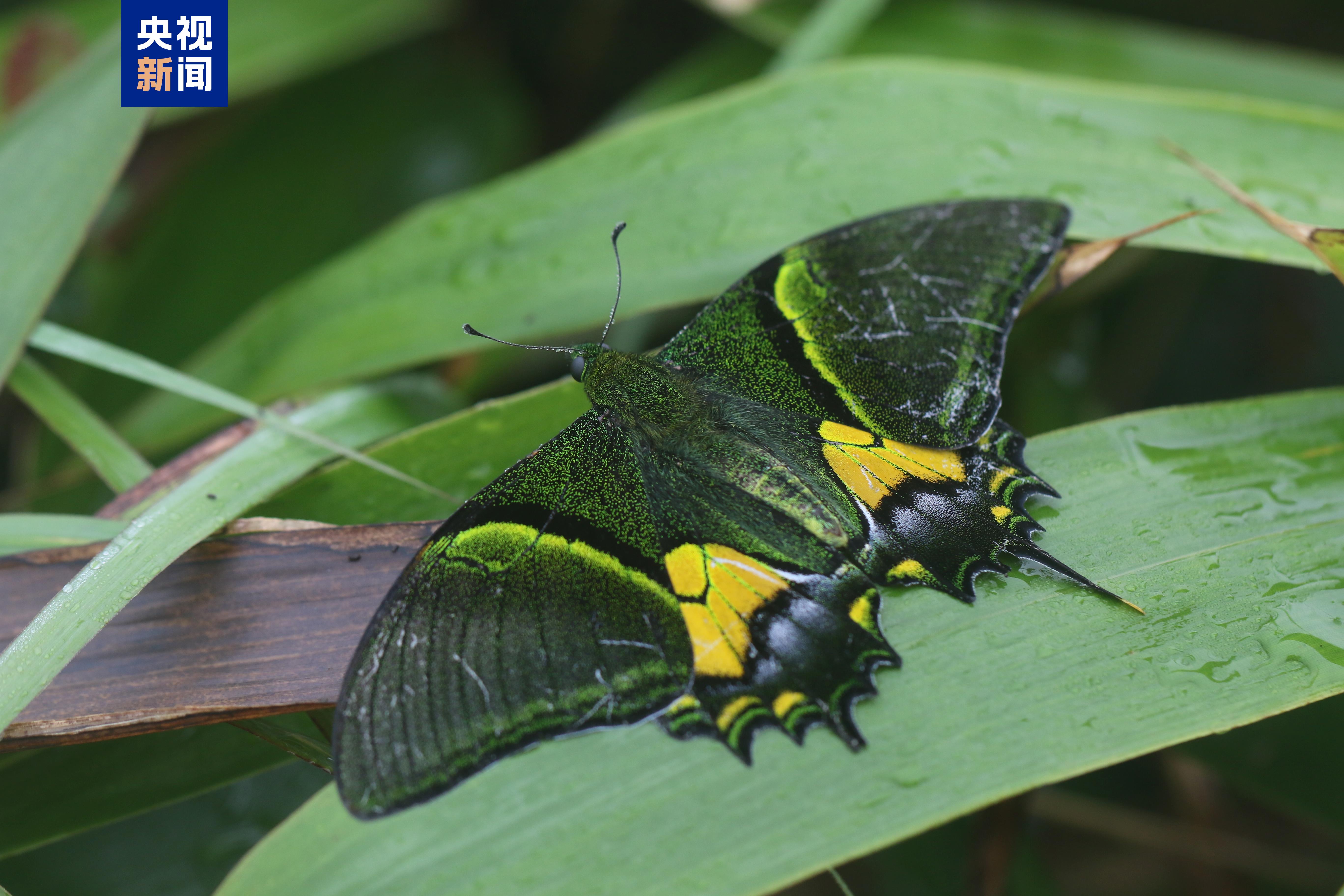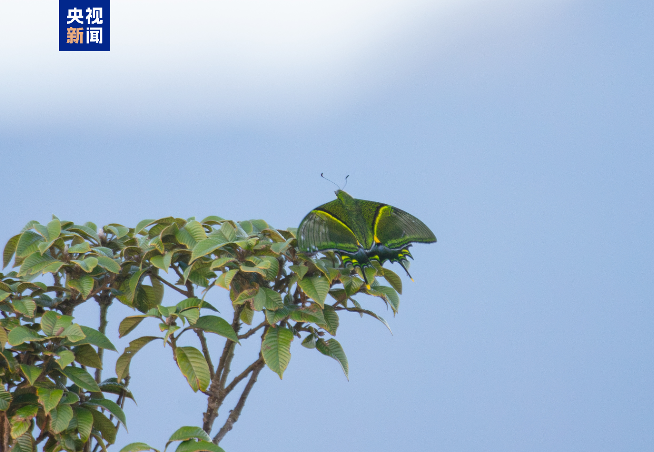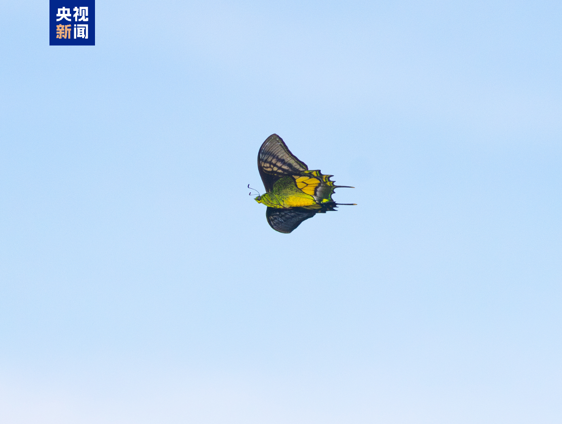 據調查團隊介紹,此次觀測地點位於近千米的山峯,現場記錄的金斑喙鳳蝶成蟲形態特徵清晰可辨:前翅金黃色斑帶和後翅中央金黃色斑紋交相輝映,尾狀突出細長且末端金黃,飛行時姿態優美靈動,符合“蝶中皇后”的典型特徵。