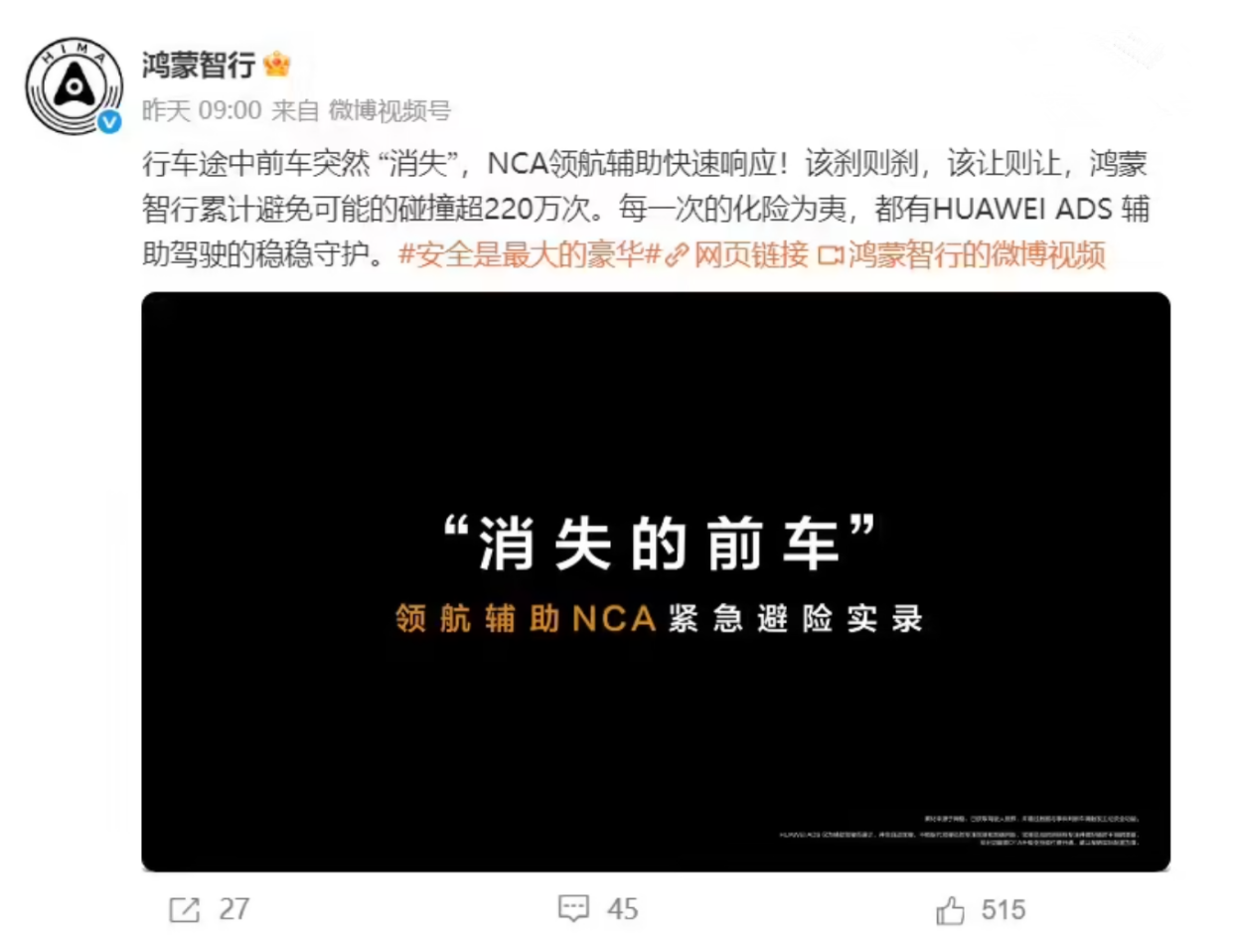 回應“消失的前車”爭議:鴻蒙智行曬NCA領航輔助實例,累計避險可能的碰撞超 220 萬次