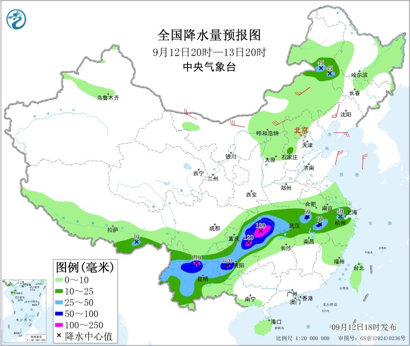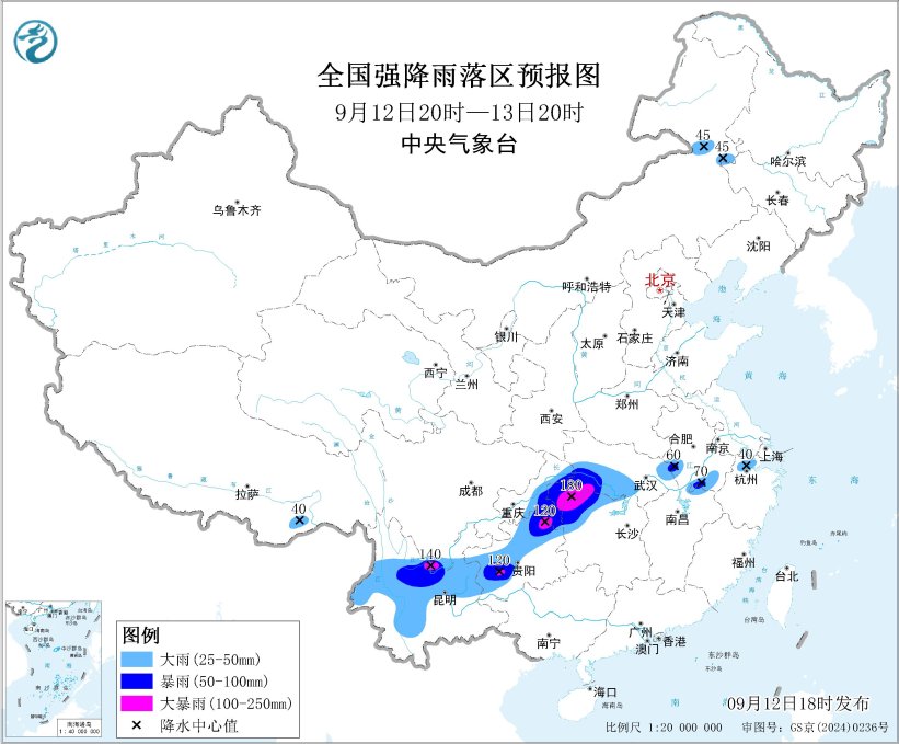 預計,12日夜間至15日,西南地區東部和南部、江漢大部、江淮南部、江南北部等地有中到大雨,部分地區有暴雨,局地大暴雨,伴有短時強降水等強對流天氣。其中,9月12日20時至13日20時,湖北東部和南部、湖南北部、重慶中南部、貴州中北部和西部、四川南部、雲南中北部、安徽中南部、江西北部、浙江北部、內蒙古東部等地部分地區有大到暴雨,其中,湖南西北部、湖北西南部、貴州西部和東北部、四川南部、雲南北部等地局部地區有大暴雨(100~180毫米)。上述部分地區伴有短時強降水(最大小時降雨量20~50毫米,局地可超過60毫米)。中央氣象台9月12日18時繼續發佈暴雨藍色預警*。*
