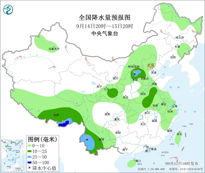 *9月14日20時至15日20時,*山西北部、河北西部、甘肅東南部、山東西南部、河南東部、安徽西北部、雲南西部、西藏東南部等地部分地區有中到大雨,其中,西藏東南部等地部分地區有暴雨(50~60毫米)。內蒙古東部、黑龍江東北部、新疆沿天山地區和南疆盆地等地部分地區有4~6級風(見圖6)。