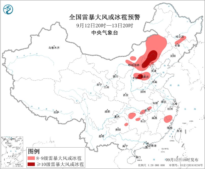 預計,未來兩天,內蒙古、華北和東北地區有強對流天氣。其中,9月12日20時至13日20時,內蒙古中東部、華北中北部、江漢東南部、江南西北部和東南部等地的部分地區將有8級以上雷暴大風或冰雹天氣,其中,內蒙古中部、河北北部、山西中部等地的部分地區將有10級以上雷暴大風。中央氣象台9月12日18時發佈**強對流天氣藍色預警。