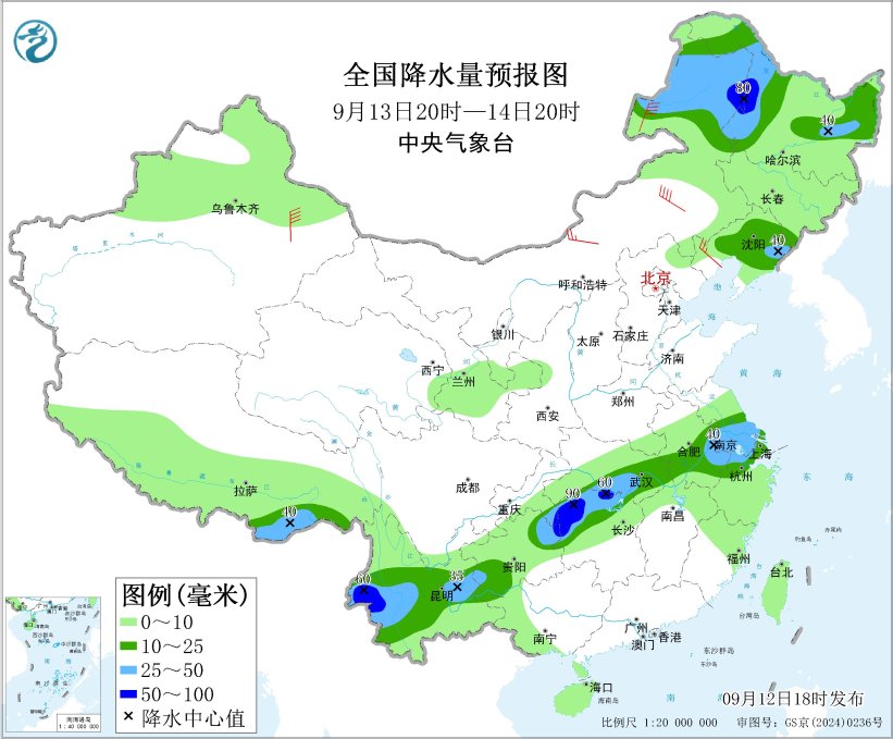 圖4 全國降水量預報圖(9月12日20時-13日20時)