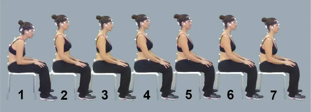 這篇綜述對 544 名希臘物理治療師進行了調查,旨在研究其對最優站姿和坐勢的看法,及其如何描述和量化姿勢特徵與最佳姿勢。97.5% 的物理治療師選擇了姿勢 2、4、5 ,其中,近一半人( 41.4% )選擇了姿勢 2 —— 腰椎處於前凸狀態,胸椎處於輕微後凸狀態,骨盆、頭部和肩部在一條直線上,下巴適度回收。這種姿勢與人類脊柱的生理彎曲是相符的。