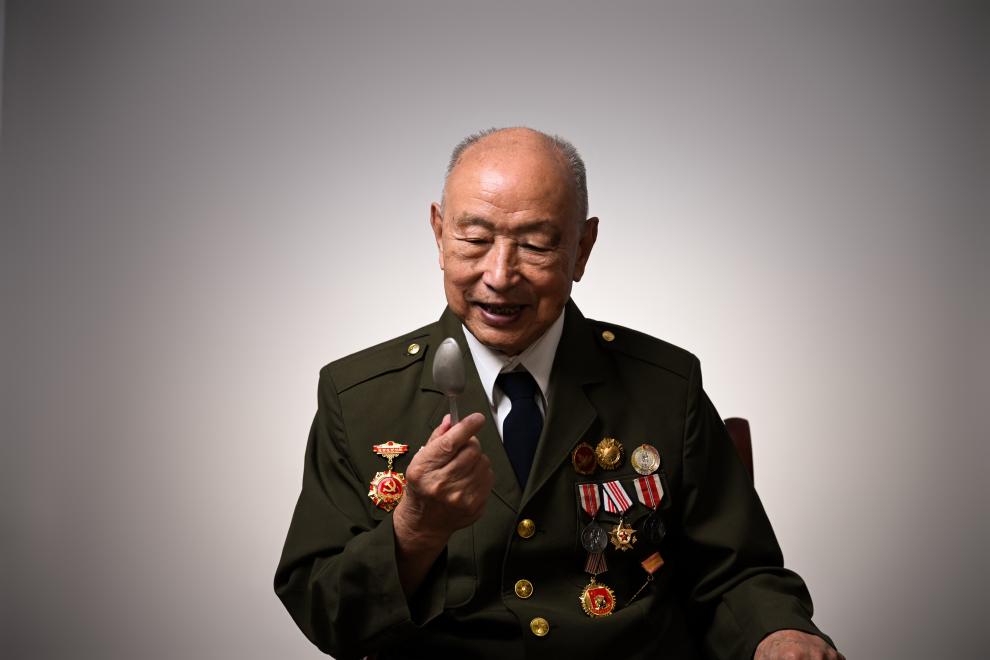 拍攝於2024年7月的照片顯示志願軍老戰士曾國興手持戰友贈送的勺子。新華社記者 楊青 攝