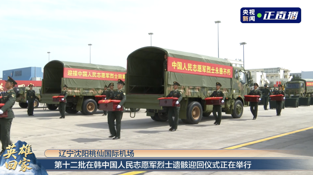 “異國埋忠骨,山河盼英魂。70多年前,中國人民志願軍先烈拋灑熱血、以身許國,譜寫了雄壯史詩,鑄就了不朽豐碑。各位先烈,祖國沒有忘記你們,人民沒有忘記你們,歷史沒有忘記你們。今天,我們承載着祖國和人民的期盼,承載着親人與戰友的思念,接迎英雄回家。向英雄致敬!”