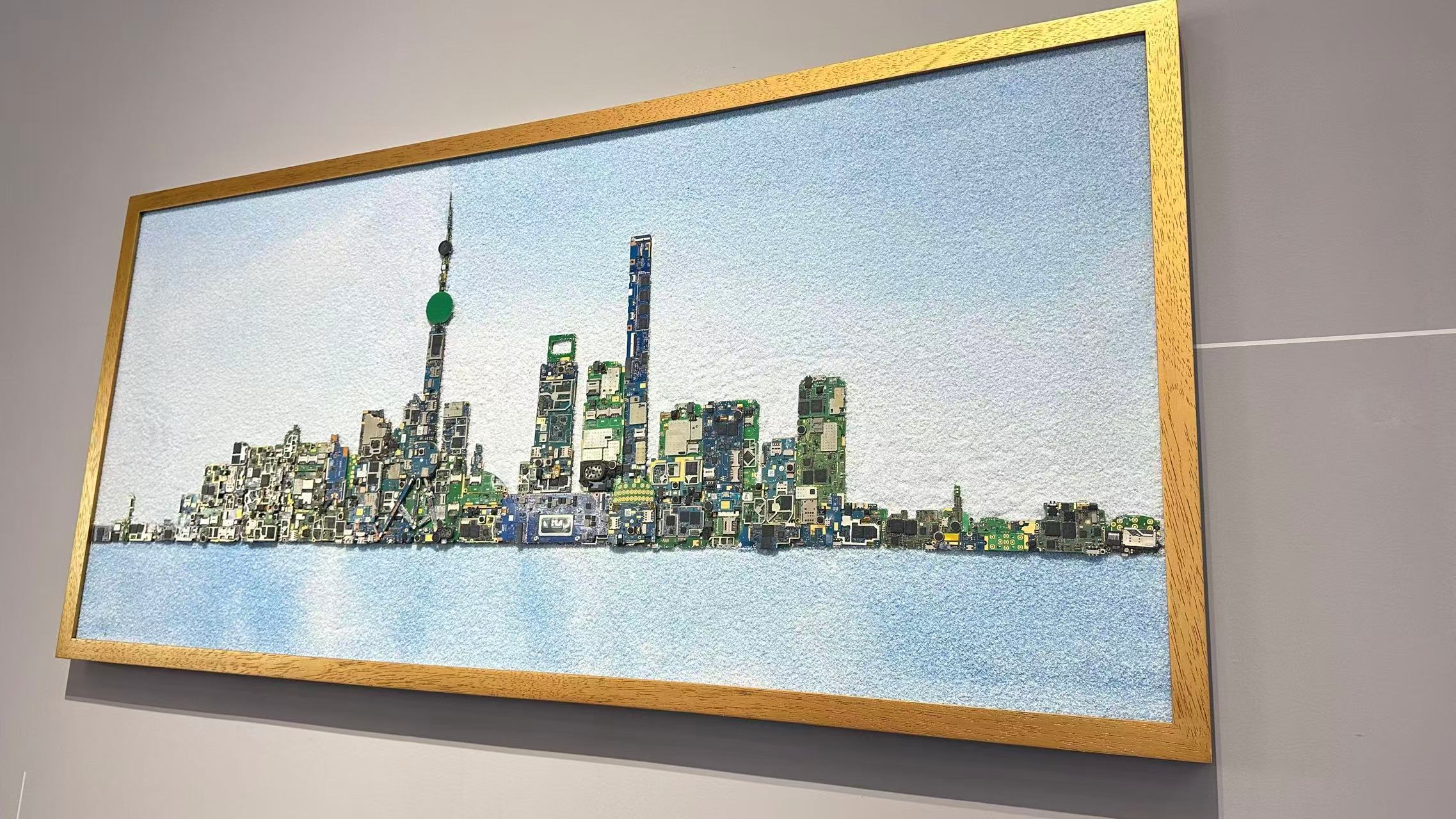 華勤用主板零件拼出的上海陸家嘴地標畫。王崟欣攝