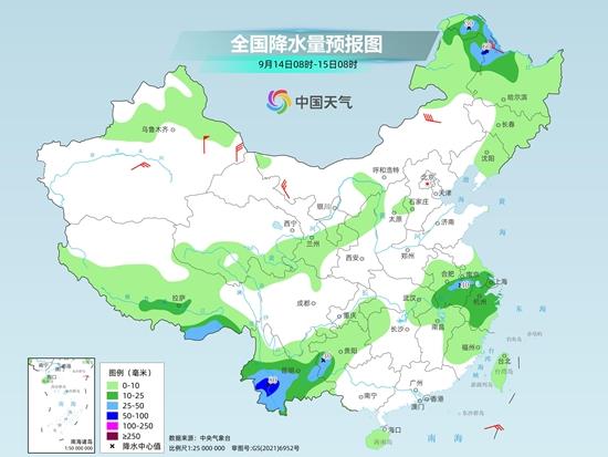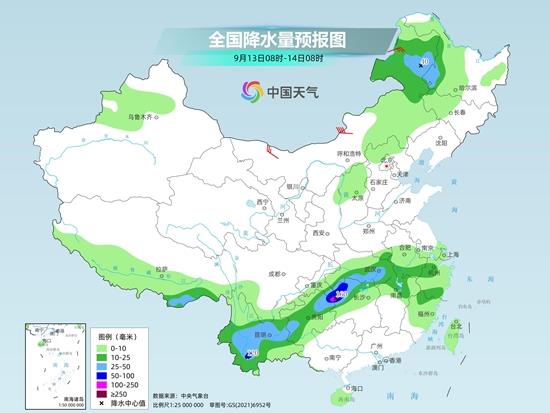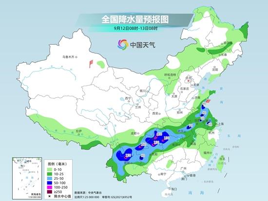 9月12日至13日,黃淮地區降雨強度有所減弱,雨帶有所南壓,江蘇、湖南、四川盆地、貴州、雲南等地的部分地區將有暴雨天氣,局地大暴雨,需注意防範。在強降雨並未影響到的華南一帶,暑熱依舊,多地未來一週高温全勤。