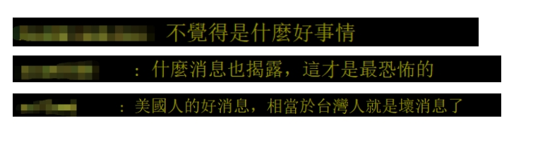 台媒注意到,這一消息曝光後,在島內網絡論壇掀起網民議論,有不少人表示,“不覺得是什麼好事情”“什麼消息也沒揭露,這才是最恐怖的”“美國人的好消息,相當於台灣人就是壞消息了”。
