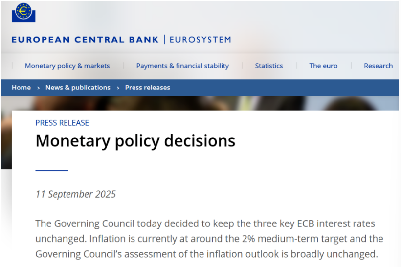 歐洲央行在聲明中強調,當前通脹水平處於2%的中期目標附近,管理委員會對通脹前景的評估基本保持不變。根據最新預測,2025年整體通脹率為2.1%,2026年為1.7%,2027年為1.9%,與6月預期相比,上調了2025年和2026年的通脹預期,下調了2027年的預期。核心通脹率方面,預計2025年為2.4%,2026年為1.9%,2027年為1.8%。經濟增長方面,歐洲央行預計2025年GDP增長率為1.2%,較6月預測的0.9%有所上調,2026年小幅下調至1.0%,2027年維持1.3%不變。分析指出,這一決策背後主要得益於近期歐元區經濟數據的改善,以及美歐貿易協定帶來的外部環境緩和。