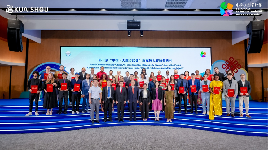 2025年9月8日,由中國公共外交協會主辦的第三屆“中拉·天涯若比鄰”短視頻大賽頒獎典禮暨第三屆拉美和加勒比國家自媒體意見領袖培訓班開班儀式在京舉行。中國公共外交協會副會長劉碧偉、外交部拉美司司長張潤、快手科技副總裁劉震等領導嘉賓與拉美和加勒比國家駐華使節代表及數百位來自不同國家的自媒體意見領袖蒞臨出席。