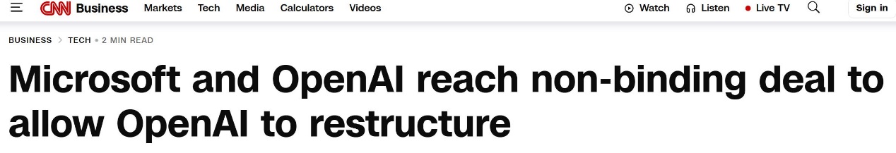微軟與OpenAI達成非約束性協議,OpenAI重組為營利性公司邁出關鍵一步