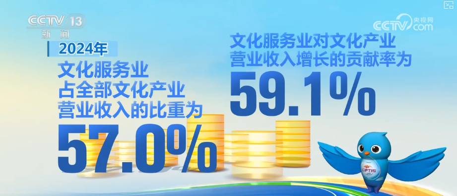 2024年,全國文化產業實現營業收入191423億元,營收規模再創歷史新高,比上年增長7.1%。2024年,文化服務業實現營業收入109134億元,比上年增長7.4%,佔全部文化產業營業收入的比重為57.0%,文化服務業對文化產業營業收入增長的貢獻率為59.1%。