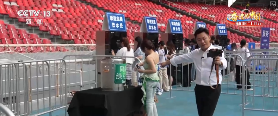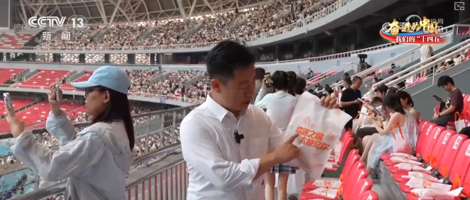 在演唱會現場,一些温暖的細節隨處可見。比如在每一個座位上都有這樣的一個小禮包,上面寫着“歌迷之城,太原寵你”的字樣。這裏有石頭餅、醋,山西的特色小點心,每個座位上還有這樣的應援棒。