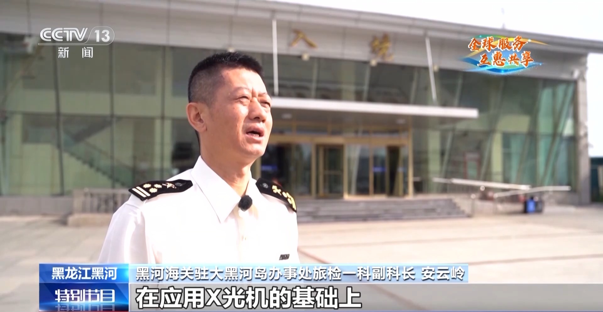*黑河海關駐大黑河島辦事處旅檢一科副科長 安雲嶺:*動態調整通關路線,在應用X光機的基礎上,我們又引進了智能巡檢儀、檢疫犬等構建立體式查驗通道,確保無異常旅客快速有序通關。
