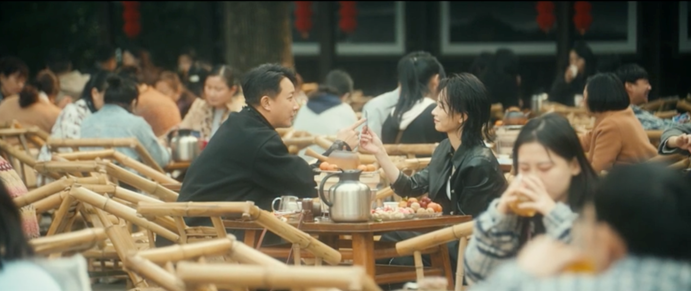 電影中,孟雲和柳柳一起去茶鋪喝茶,二人在竹椅對坐,面前的泥爐上煮着茶壺,兩人邊喝茶邊聊天,悠閒愜意。這個鏡頭取景的茶鋪,正是成都無數茶鋪的縮影。