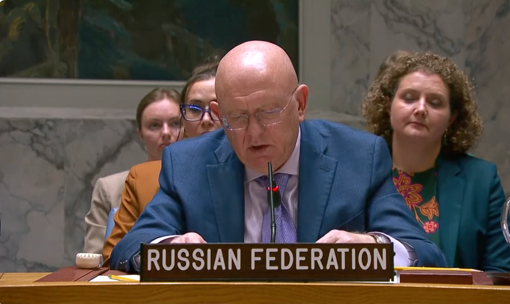 俄羅斯常駐聯合國代表涅邊賈在安理會審議波蘭領空無人機事件時發言的視頻截圖。