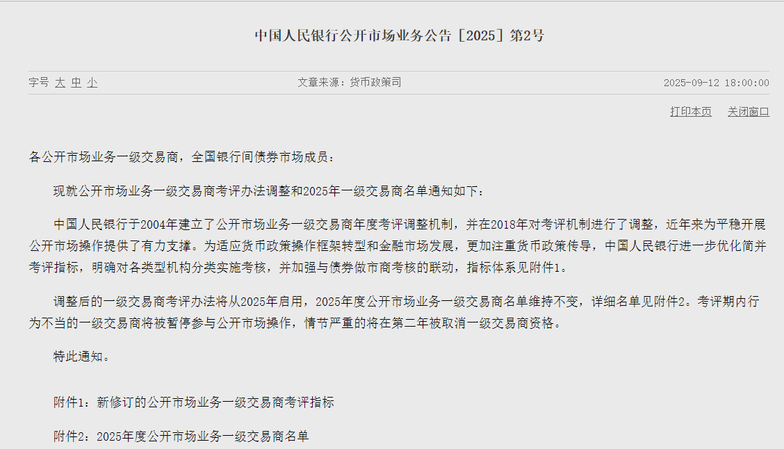 【環球網財經綜合報道】9月12日晚間,中國人民銀行發佈公告,宣佈自2025年起啓用新版公開市場業務一級交易商考評辦法,2025年度一級交易商名單暫不調整。此次調整是貨幣政策框架轉型的重要舉措,旨在優化交易商結構並強化政策傳導效能。