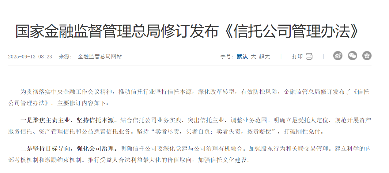 【環球網財經綜合報道】9月12日,新修訂的《信託公司管理辦法》(下稱《辦法》)正式發佈,將於2026年1月1日起施行。這是該辦法自2007年出台以來首次修訂,標誌着信託行業合規管理體系迎來專項制度性約束。