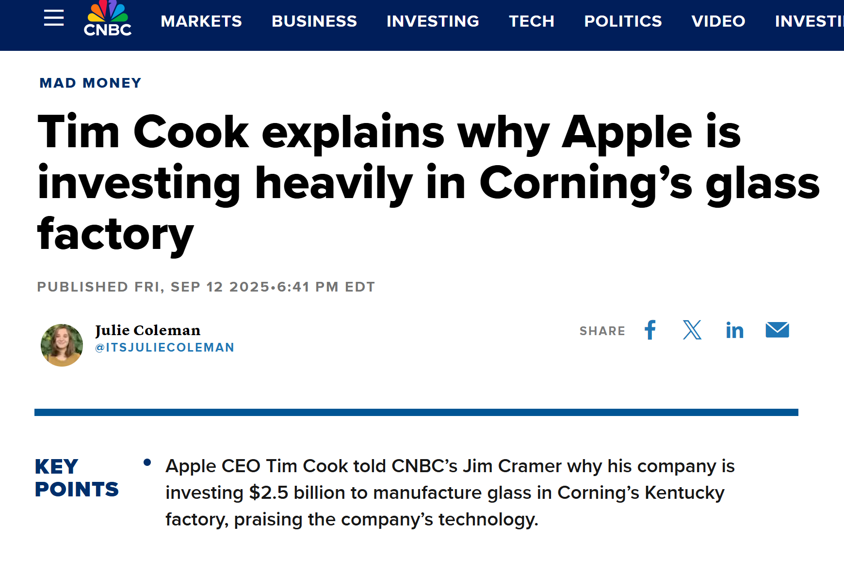 【環球網科技綜合報道】9月13日消息,據CNBC報道,蘋果公司首席執行官蒂姆·庫克前往美國肯塔基州哈羅茲堡的康寧工廠參觀,並接受美國消費者新聞與商業頻道(CNBC)主持人吉姆·克萊默(Jim Kramer)專訪。期間,庫克不僅展示2025款iPhone系列新品、介紹AirPods新功能,更針對外界關注的iPhone Air續航問題作出回應,同時宣佈蘋果將對該康寧工廠進行投資改造,進一步深化雙方在消費電子玻璃製造領域的合作,加碼美國本土製造業佈局。