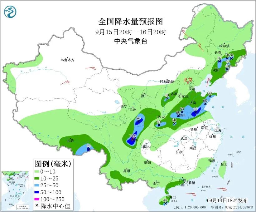 *15日20時至16日20時,*東北地區東部和南部、西藏南部和東部、西北地區東部、山西中部、河北南部、黃淮、西南地區東北部、廣東西南部、海南島等地部分地區有中到大雨,其中,吉林東部、遼寧北部、西藏東南部、甘肅南部、山東南部、河南中部、安徽北部、江蘇北部、四川盆地西部等地部分地區有暴雨或大暴雨。