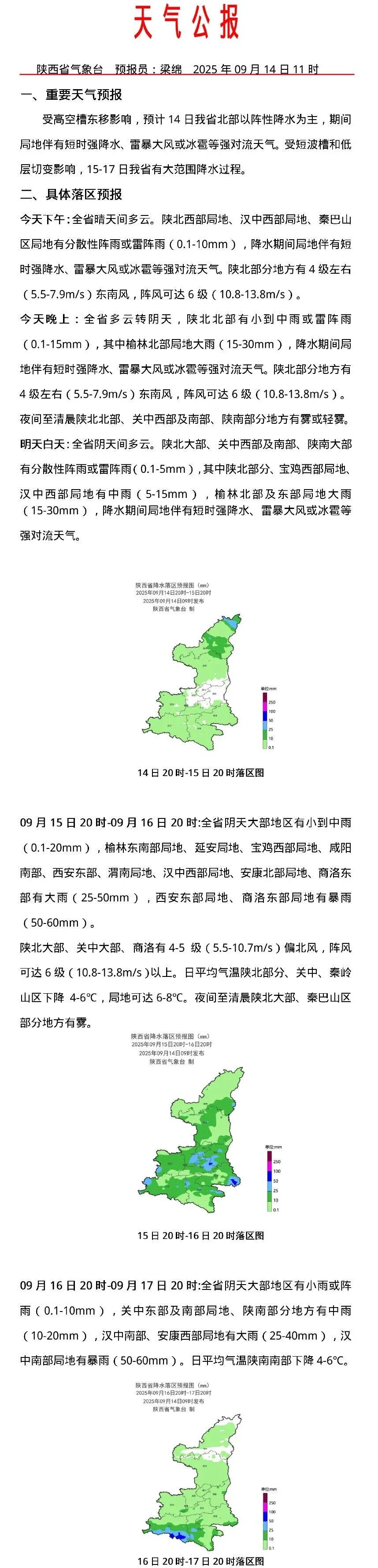 9月以來,陝北南部、關中大部、陝南大部降水量較常年偏多5成到2倍。目前陝北南部、陝南西部和秦巴山區土壤含水量過飽和,中南部河流底水較高。15日之後我省還有大範圍降水過程,累積雨量大、落區重疊度高,發生山洪、地質災害、中小河流洪水、城市暴雨積澇、農田漬澇的氣象風險高。請相關地區和部門關注當地氣象部門“13161”遞進式監測預報預警,對重點地區、災害隱患點及累計雨量較大區域進行再研判和再排查,加強跨省跨域跨市協調聯防聯控,做好農田排澇和病蟲害防治,全力以赴保秋糧安全。