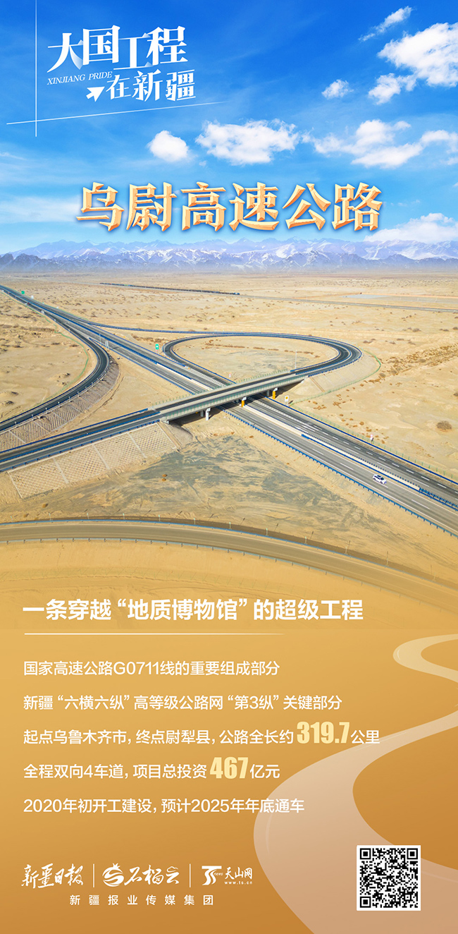 烏尉高速公路(G0711),起點烏魯木齊市,終點尉犁縣,公路全長約319.7公里,全程雙向4車道。項目總投資467億元,於2020年初開工建設。