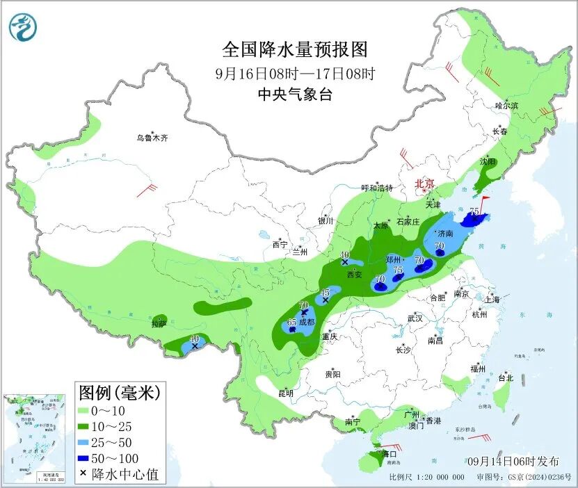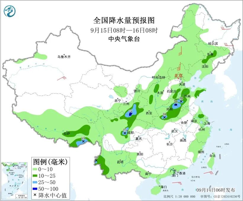 今明兩天(9月14日至15日),南方降雨逐步縮減,較強降雨主要出現在西南部分地區。後天,黃淮到四川盆地一帶新一輪降水過程發展,需注意防範降雨可能引發的次生災害。氣温方面,未來幾天,南方高温先增多後減少,北方多地氣温將創下半年來新低,秋涼漸顯。