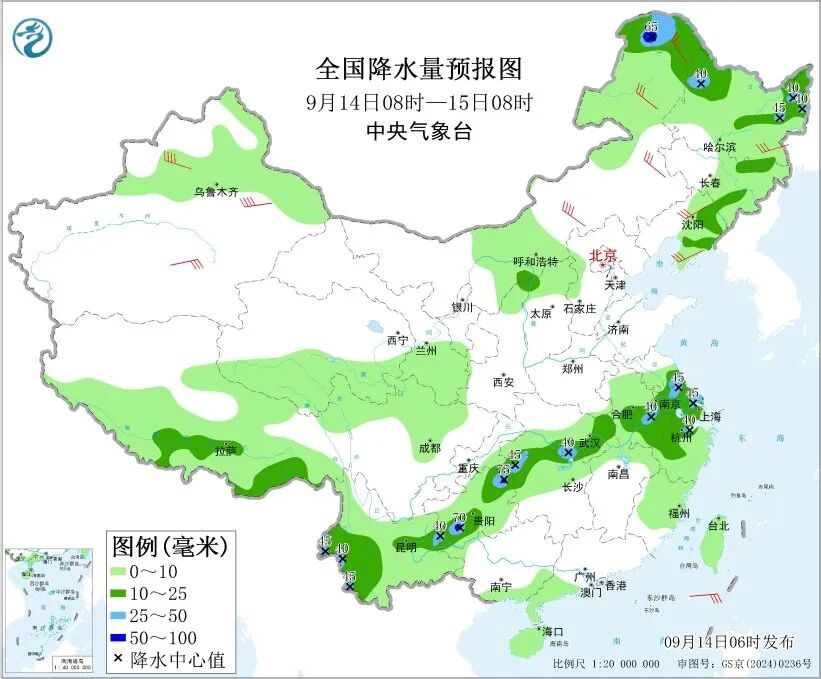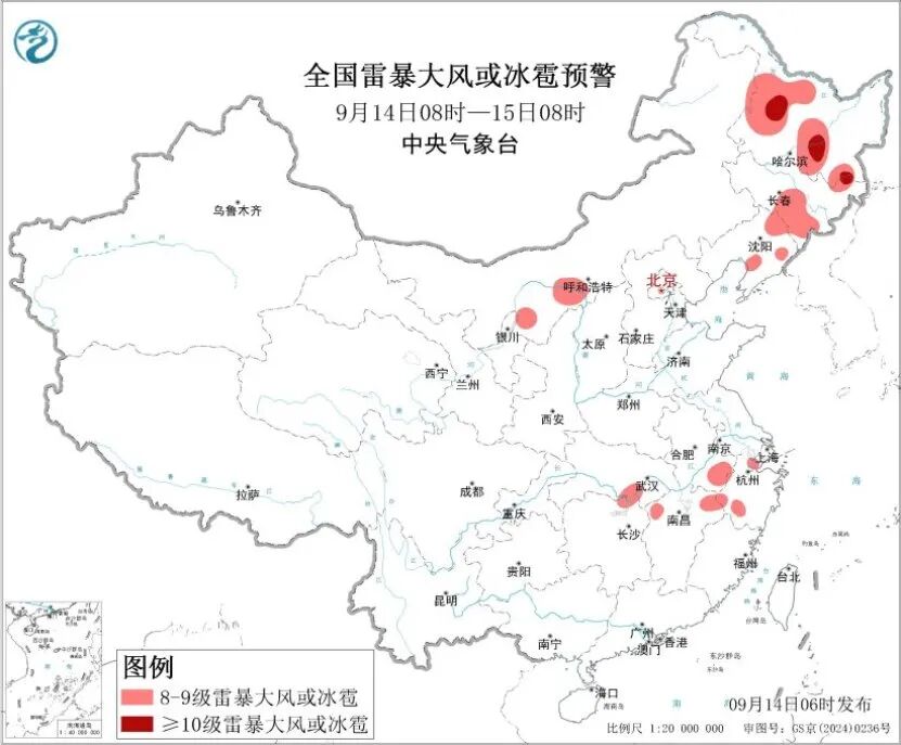 中央氣象台9月14日06時繼續發佈強對流天氣藍色預警:預計9月14日08時至15日08時,內蒙古中西部、東北地區、江南北部等地的部分地區將有8級以上雷暴大風或冰雹天氣,其中,黑龍江中部和東南部等地的部分地區將有10級以上雷暴大風;東北地區、華北西北部、江南北部、西南地區東部和西南部等地的部分地區將有小時雨量大於20毫米的短時強降水天氣,其中,重慶東南部、貴州西南部等地的部分地區小時雨量大於50毫米,最大可達60毫米以上。預計,強對流的主要影響時段為今天白天。