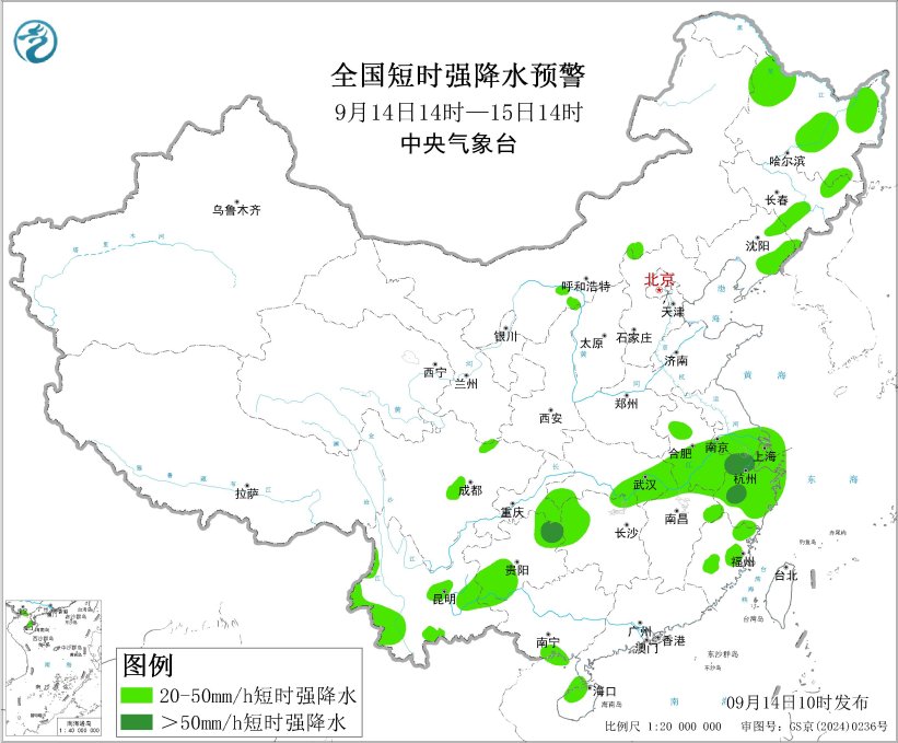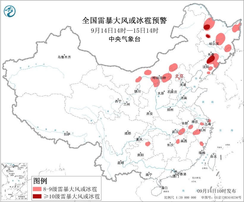 預計9月14日14時至15日14時,內蒙古中部、華北北部、東北地區、江淮南部、江南東北部等地的部分地區將有8級以上雷暴大風或冰雹天氣,其中,黑龍江西部、吉林中南部、遼寧北部等地的部分地區將有10級以上雷暴大風,最大風力可達11級以上;東北地區、江漢東部、江淮南部、江南北部、西南地區東部和南部等地的部分地區將有小時雨量大於20毫米的短時強降水天氣,其中,安徽東南部、江蘇南部、浙江北部、貴州東北部等地的部分地區小時雨量大於50毫米,最大可達70毫米以上。