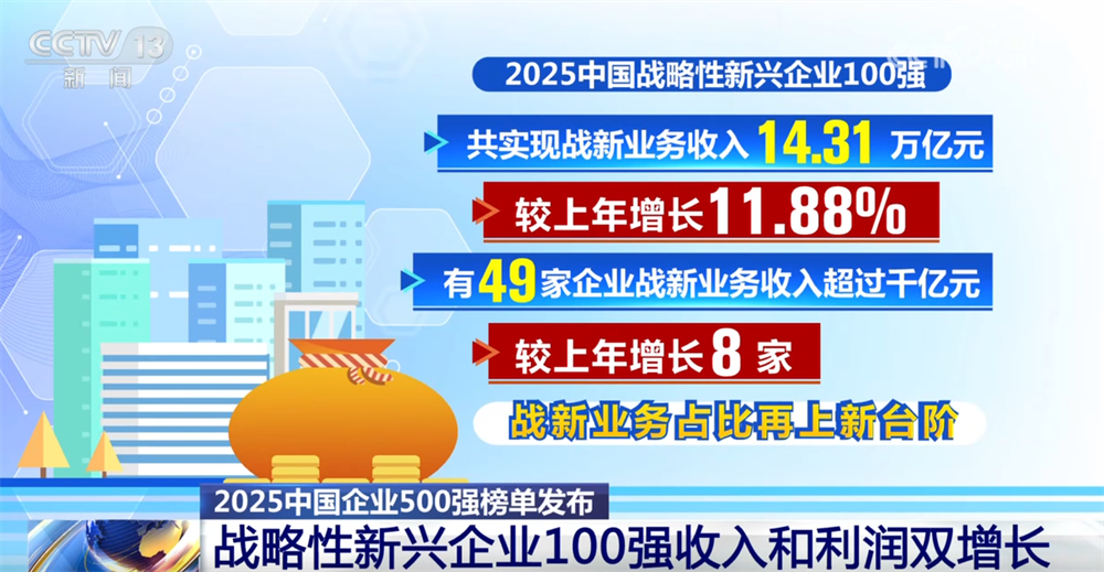 此次同步發佈的中國企業500強榜單還包括戰略性新興產業100強等一系列專項榜單。記者注意到,其中,2025中國戰略性新興企業100強的收入和利潤均實現增長。
