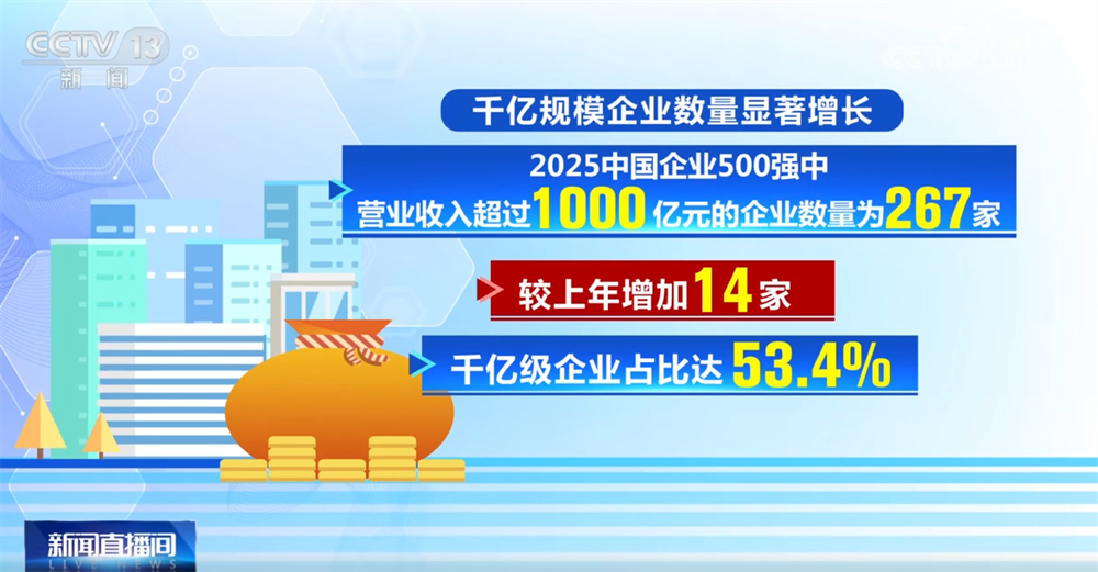 此外,千億規模企業數量顯著增長,2025中國企業500強中,營業收入超過1000億元的企業數量為267家,較上年增加14家,千億級企業佔比達53.4%。