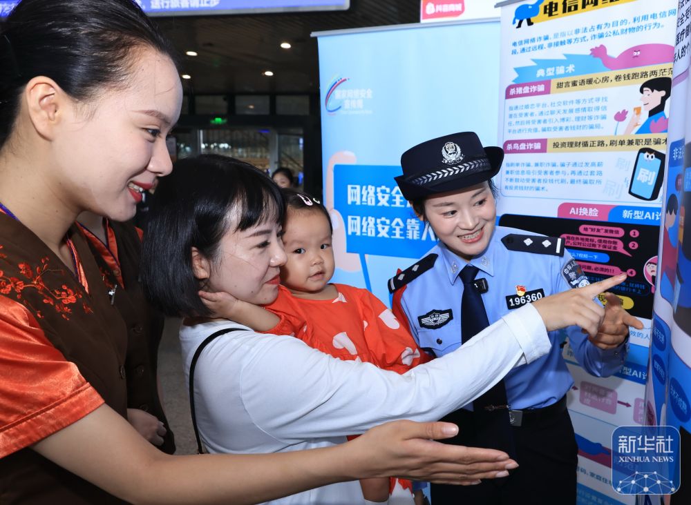 9月15日,湖北武漢鐵路公安處武漢站派出所民警在武漢站為旅客講解網絡安全知識。新華社發(趙軍攝)