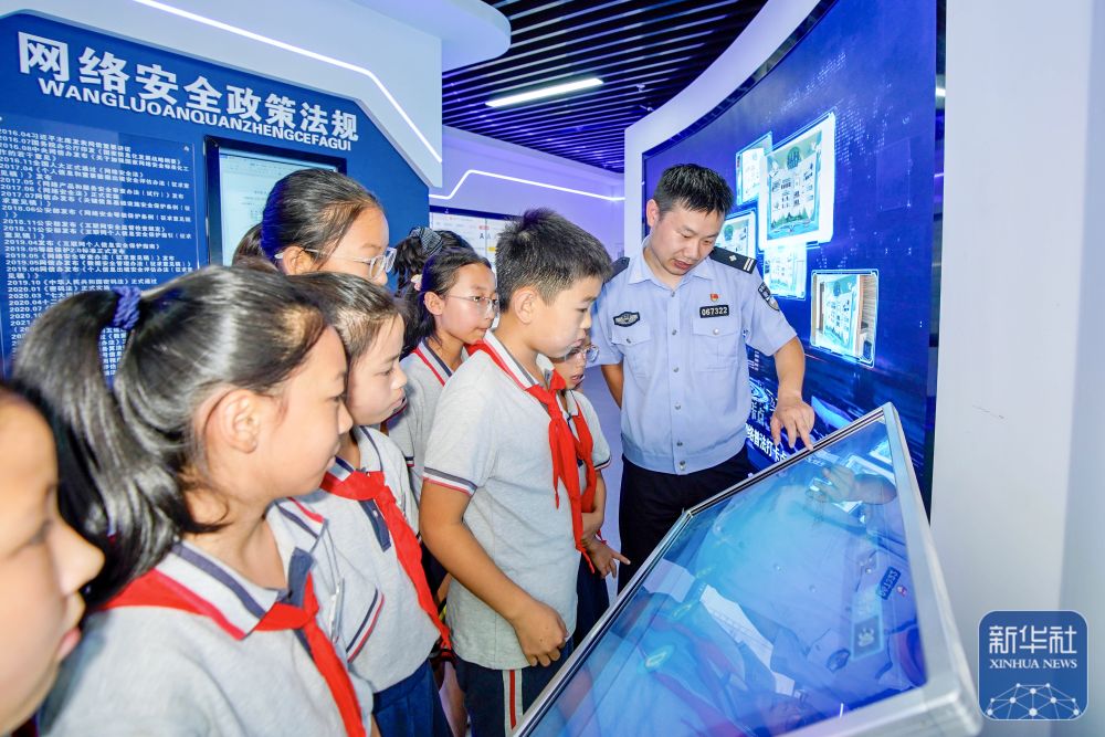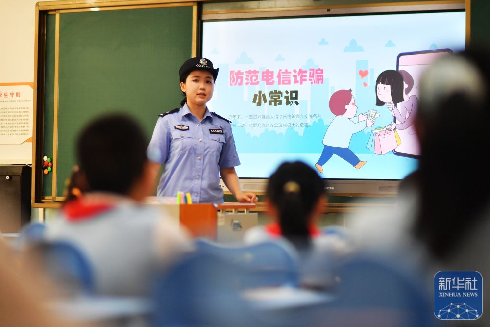 9月15日,在山東省青島市市北區延安二路小學開展的網絡安全教育主題活動上,民警為學生們講解防範電信詐騙小常識。新華社發(王海濱攝)