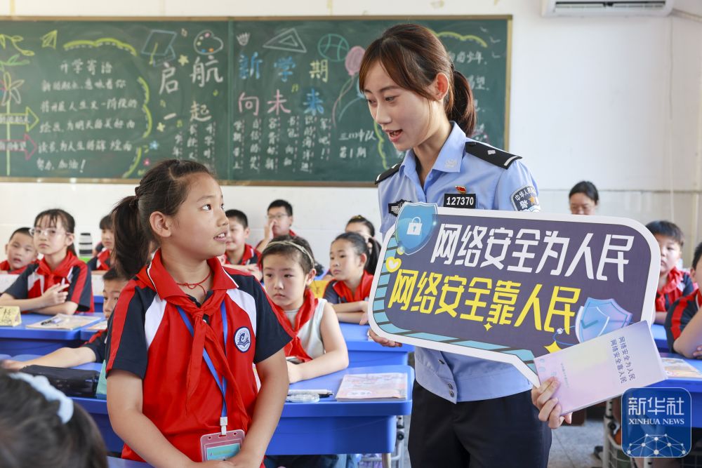 9月15日,民警在天津市濱海新區塘沽實驗小學為學生講解網絡安全知識。新華社發(杜鵬輝攝)