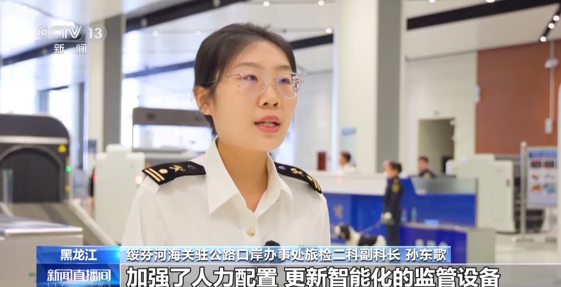 *綏芬河海關駐公路口岸辦事處旅檢二科副科長 孫東歌:*加強了人力配置,更新智能化的監管設備,同時我們也完善了為特殊羣體旅客提供綠色通道服務的應急預案。