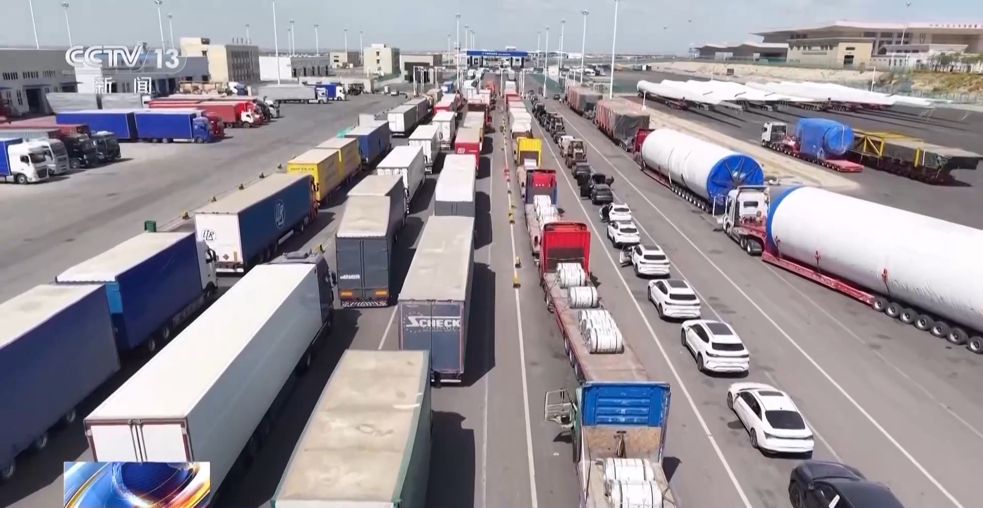 *總枱央視記者 李廈:*這裏是霍爾果斯公路口岸,看我身邊龐大的車流,不僅有滿載跨境包裹的大貨車、更是有一眼望不到頭的國產新能源車和農用機械車輛,甚至還有長達數十米的風機葉片,這些琳琅滿目的中國好貨,正在24小時不停歇地從這條黃金大通道駛出國門。