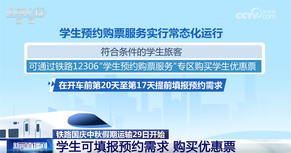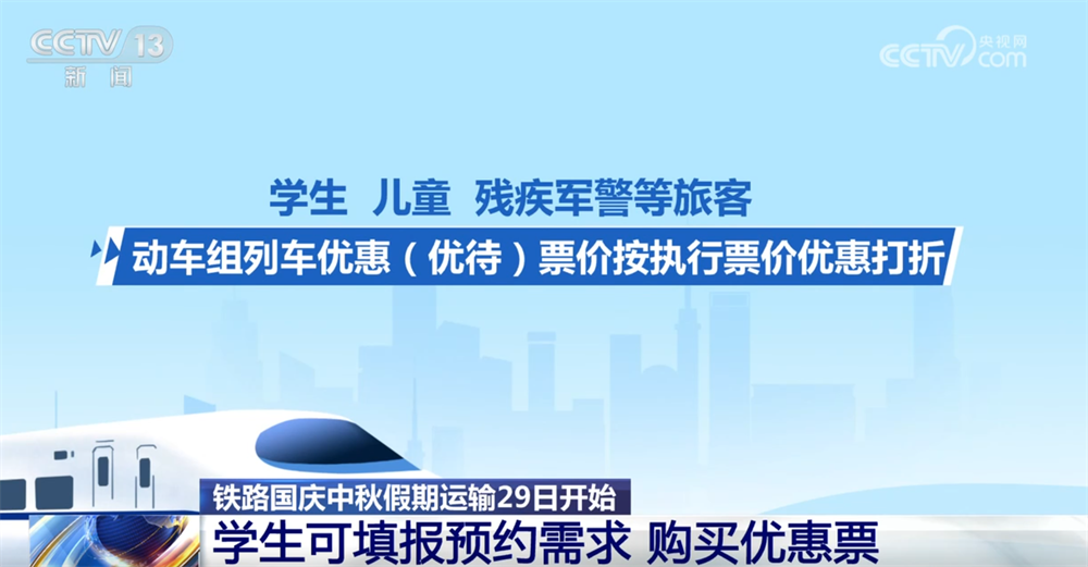學生預約購票服務實行常態化運行,符合條件的學生旅客可通過鐵路12306“學生預約購票服務”專區購買學生優惠票,在開車前第20天至第17天提前填報預約需求。學生、兒童、殘疾軍警等旅客動車組列車優惠(優待)票價按執行票價優惠打折。同時提醒旅客,國慶中秋假期車票緊張,儘量錯峯出行,在直達車票售罄的情況下,可選擇同車接續、中轉換乘等方式購票出行。