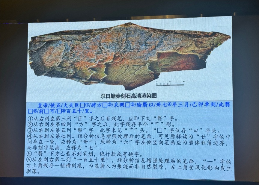 關於刻石基本信息。刻石位於青海省果洛藏族自治州瑪多縣扎陵湖鄉卓讓村,地處扎陵湖北岸尕日塘坡地2號陡坎左下方,距湖岸約200米,海拔4306米。文字刻鑿壁面總長82釐米,最寬處33釐米,刻字區面積約0.16平方米,距地面約19釐米。全文共12行36字,外加合文1字,共37字,文字風格屬秦篆,保存較完整的文字信息為“皇帝/使五/大夫臣□/將方□/採樂□/陯翳以/卅七年三月/己卯車到/此翳□/前□可/□百五十/裏”。