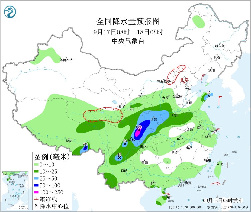 預計,9月15日至17日,西北地區東部、西南地區東北部、黃淮等地有較強降水過程,大部地區有中到大雨,部分地區有大到暴雨,其中,四川盆地中西部和北部、河南東部、山東西部和東部等地的部分地區有大暴雨,上述部分地區伴有短時強降水(最大小時雨量有20-30毫米,局地可達40-60毫米),局地有雷暴大風等強對流天氣。