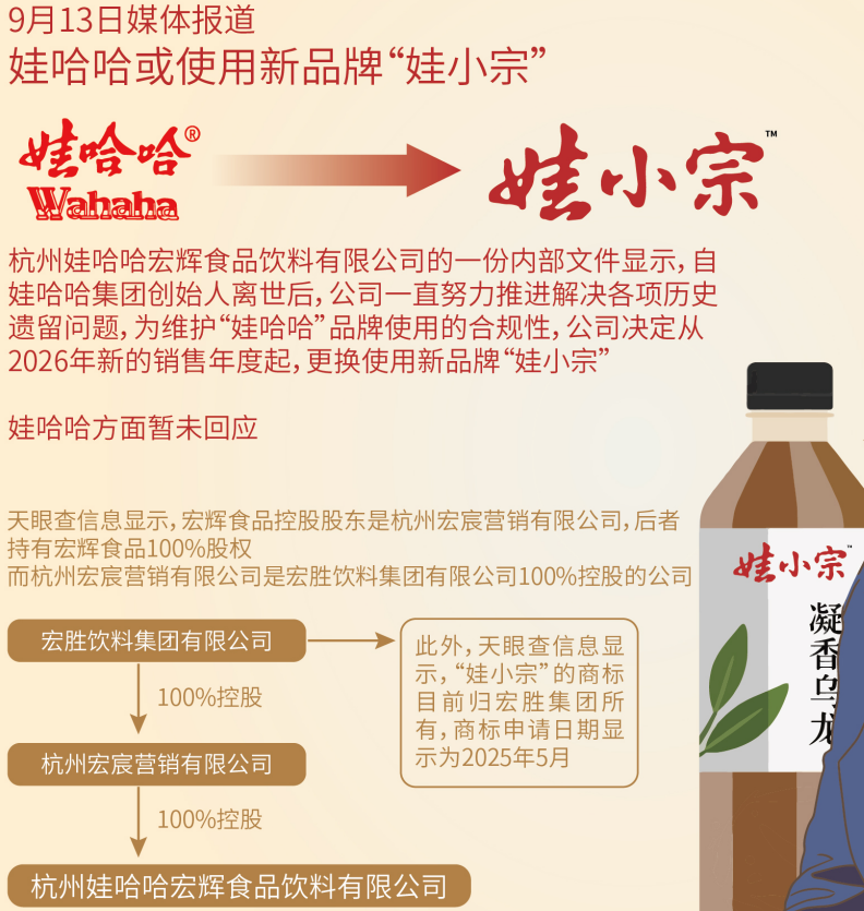 9月13日,一份據稱是杭州娃哈哈宏輝食品飲料有限公司的內部文件《關於開展2026銷售年度經銷商溝通工作的通知》在網絡上流傳。文件中明確提到,“自娃哈哈集團創始人離世後,公司一直努力推進解決各項歷史相關遺留問題”。為確保品牌使用的合規性,該公司決定從2026銷售年度起,更換使用新品牌“娃小宗”。文件的核心解釋在於,在現行股權架構下,“娃哈哈”商標的使用,必須獲得娃哈哈集團全體股東的一致同意,任何一方均無權單獨使用。因此,公司將持續與相關股東就“娃哈哈”商標使用事宜保持積極溝通。